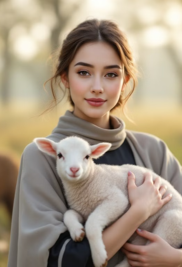 白い羊と共にある純真な子どもは