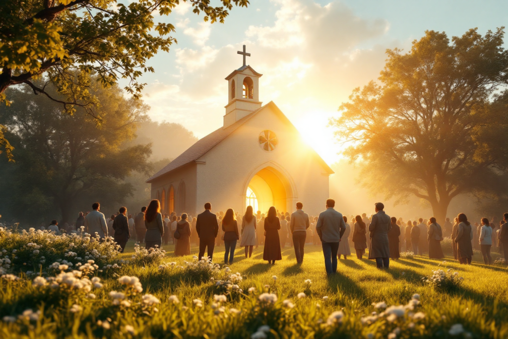 朝日に照らされた礼拝堂で祈る人々が
